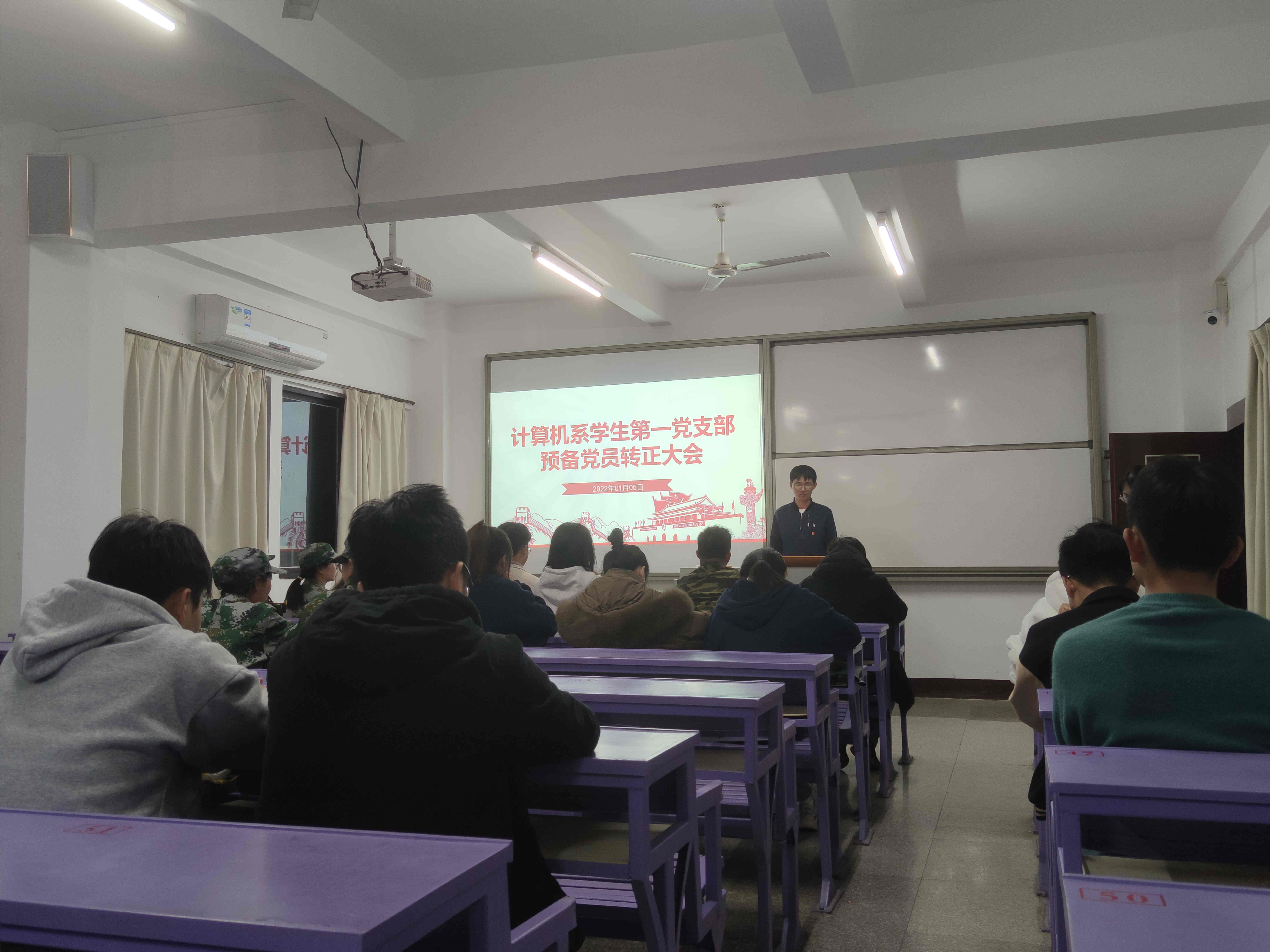 2022年1月5日晚上,计算机系员工第一支部于吉龙楼402举行预备党员转正大会。本次会议由员工第一党支部书记潘荣荣主持,出席本次大会的有宣传委员林增坦、组织委员周添丁及支部全体成员。